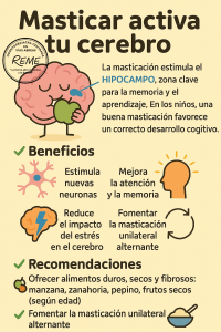 La masticación estimula el hipocampo, zona clave para la memoria y el aprendizaje. En los niños, una buena masticación favorece un correcto desarrollo cognitivo.